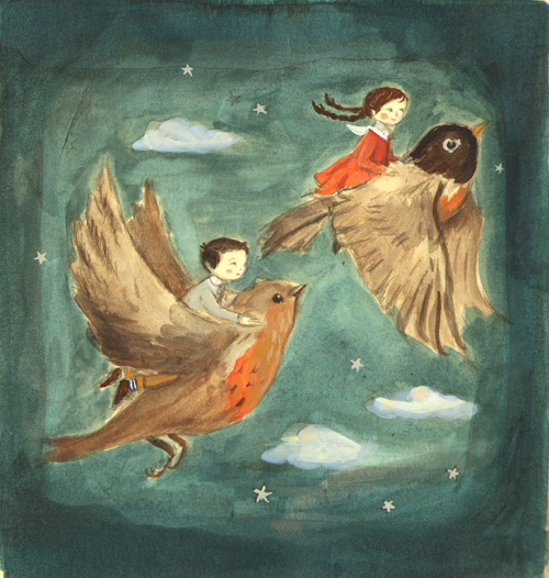I love seeing the sketch-to-final journeys of Emily Wingfield Martin’s images. I really like the flying bicycle and the birdies.