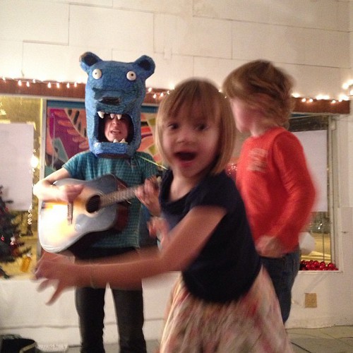 That really should say six questions over breakfast. And no Pivot Questionnaire, which my visitor today, author-illustrator Kevin Sherry, opted out of. This is fine. He’s a busy guy, because as you can see here, he doesn’t just create books. He also dons his big blue bear head to entertain crowds of dancing children, guitar in hand (which you can read about below).